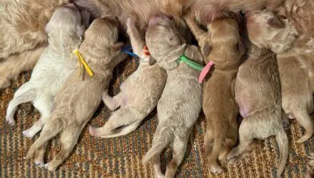 What an adorable litter of pups! They are a little advanced for their age, as they started going potty outside of the whelping box shortly after their eye opened. We decided to try them a bit earlier with softened food, and they were all very enthused and ready for it!
